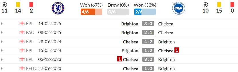 Trong 6 lần gặp nhau gần nhất giữa Chelsea vs Brighton, Chelsea nhỉnh hơn với 4 chiến thắng, trong khi Brighton có 2 lần ca khúc khải hoàn. Tuy nhiên, ở hai trận gần nhất, Brighton đều giành chiến thắng (3-0 và 2-1), qua đó chứng minh họ không còn e ngại trước Chelsea.